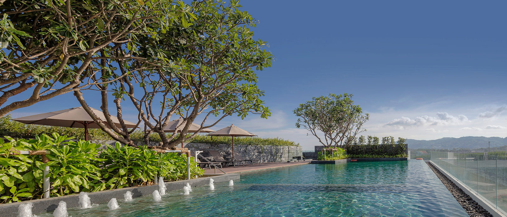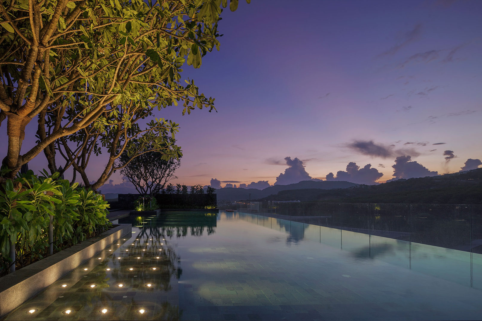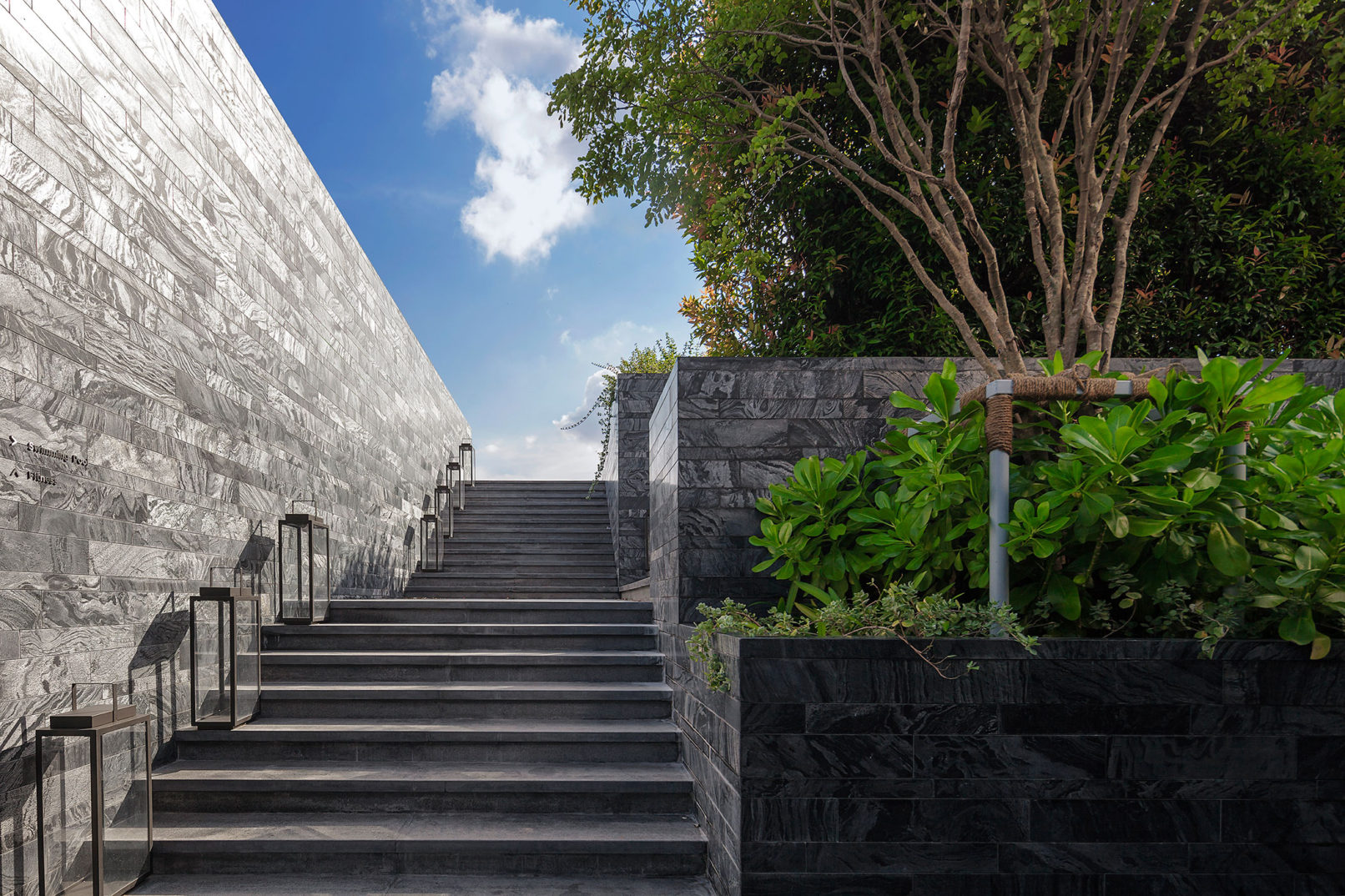 Another highlight of the landscape of the project is situated on the 7ht floor. At the very early stage of the design development process, the landscape architect and the design team of Arsom Silp worked together to determine the location of the pool in order for the area to have the best access to the 180-degree view of the city and mountain range. The common area on the 7thfloor consists of the outdoor lounge seating which is connected to the interior lounge bar. The 5 x 18 meter-pool includes additional facilities of a pool deck, a shallow area for young kids, and the outdoor shower. The varying levels of the functional spaces of the common area are linked together with a feature wall cladded with the beautiful natural stone with textural details that reminisce the pattern of inlaid pearl decoration commonly found in traditional Paranakan furniture. The feature wall leads up to the upper pool deck, which is linked to the rooftop bar and the gym’s entry, as well as the outdoor shower. Designed to serve as a recreational area with functional spaces equipped with facilities such as outdoor furniture and lighting, the pool welcomes guests to spend time relaxing throughout the day and all the way to the evening. The landscape architecture sees a wonderful mixture of perennial and floral plants as well as crawlers and groundcovers. Curated with a reference to the pattern of Paranakan textiles, the landscape is comprised of a variety of plants chosen, not only for their physical features that can provide beautifully shaded areas and green scape, but also for the long-term maintenance convenience and resilience to the heat and sunlight, as well as the strong wind and heavy rain during the long monsoon season.