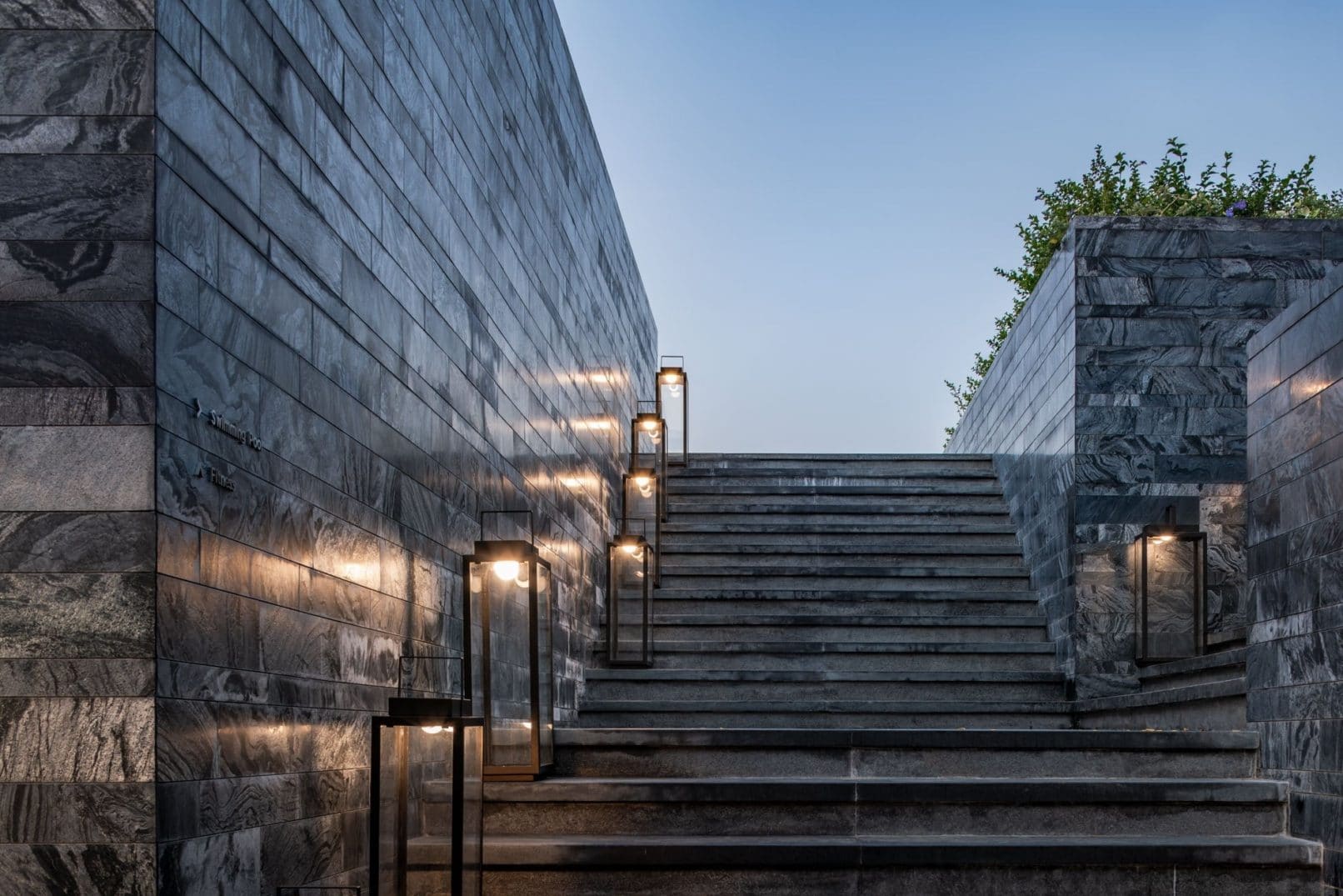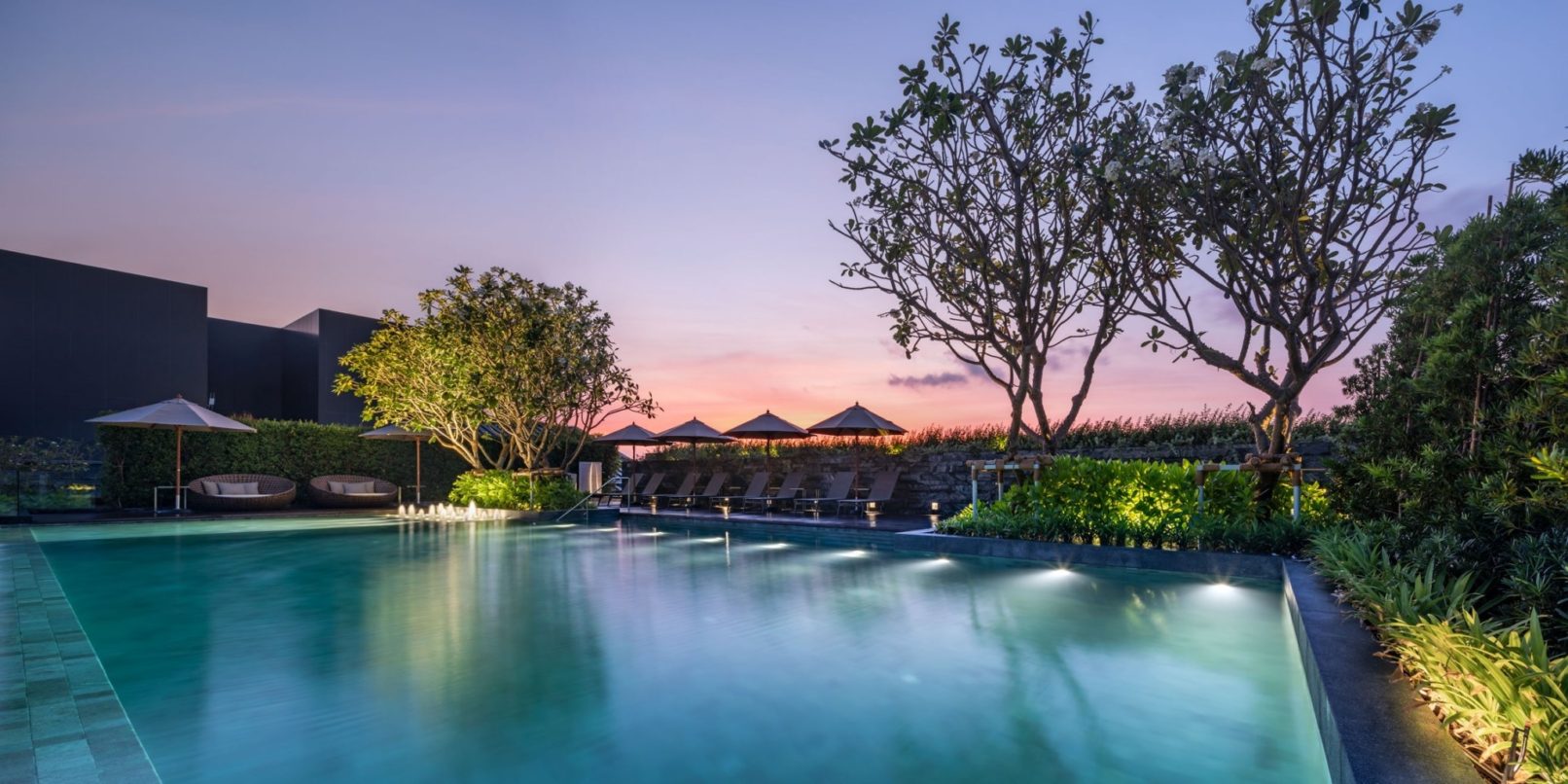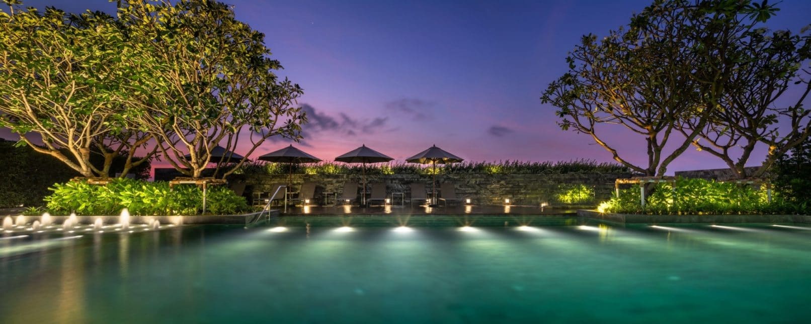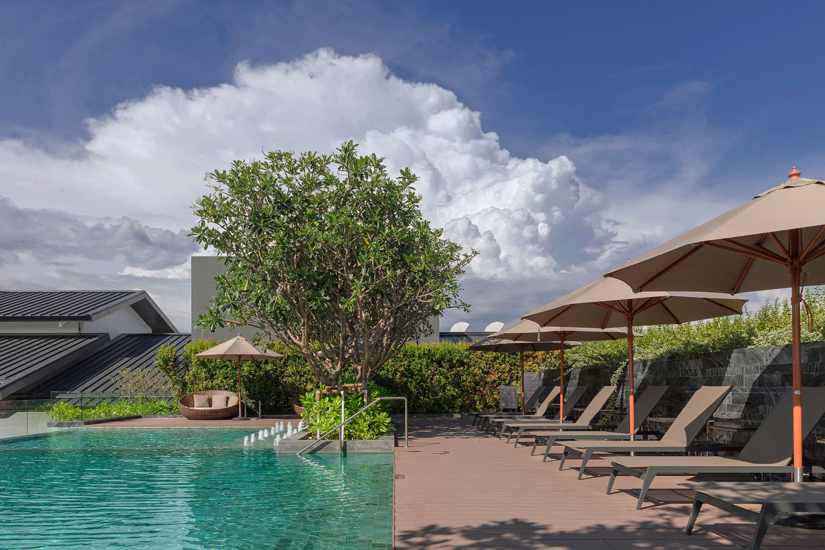 Another highlight of the landscape of the project is situated on the 7ht floor. At the very early stage of the design development process, the landscape architect and the design team of Arsom Silp worked together to determine the location of the pool in order for the area to have the best access to the 180-degree view of the city and mountain range. The common area on the 7thfloor consists of the outdoor lounge seating which is connected to the interior lounge bar. The 5 x 18 meter-pool includes additional facilities of a pool deck, a shallow area for young kids, and the outdoor shower. The varying levels of the functional spaces of the common area are linked together with a feature wall cladded with the beautiful natural stone with textural details that reminisce the pattern of inlaid pearl decoration commonly found in traditional Paranakan furniture. The feature wall leads up to the upper pool deck, which is linked to the rooftop bar and the gym’s entry, as well as the outdoor shower. Designed to serve as a recreational area with functional spaces equipped with facilities such as outdoor furniture and lighting, the pool welcomes guests to spend time relaxing throughout the day and all the way to the evening. The landscape architecture sees a wonderful mixture of perennial and floral plants as well as crawlers and groundcovers. Curated with a reference to the pattern of Paranakan textiles, the landscape is comprised of a variety of plants chosen, not only for their physical features that can provide beautifully shaded areas and green scape, but also for the long-term maintenance convenience and resilience to the heat and sunlight, as well as the strong wind and heavy rain during the long monsoon season.