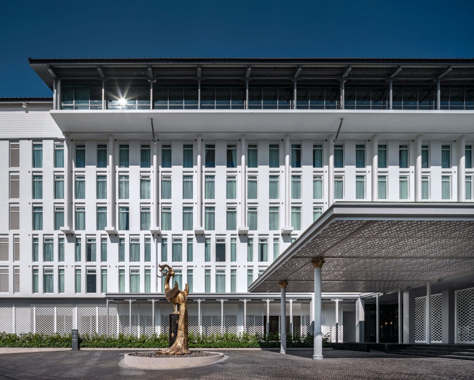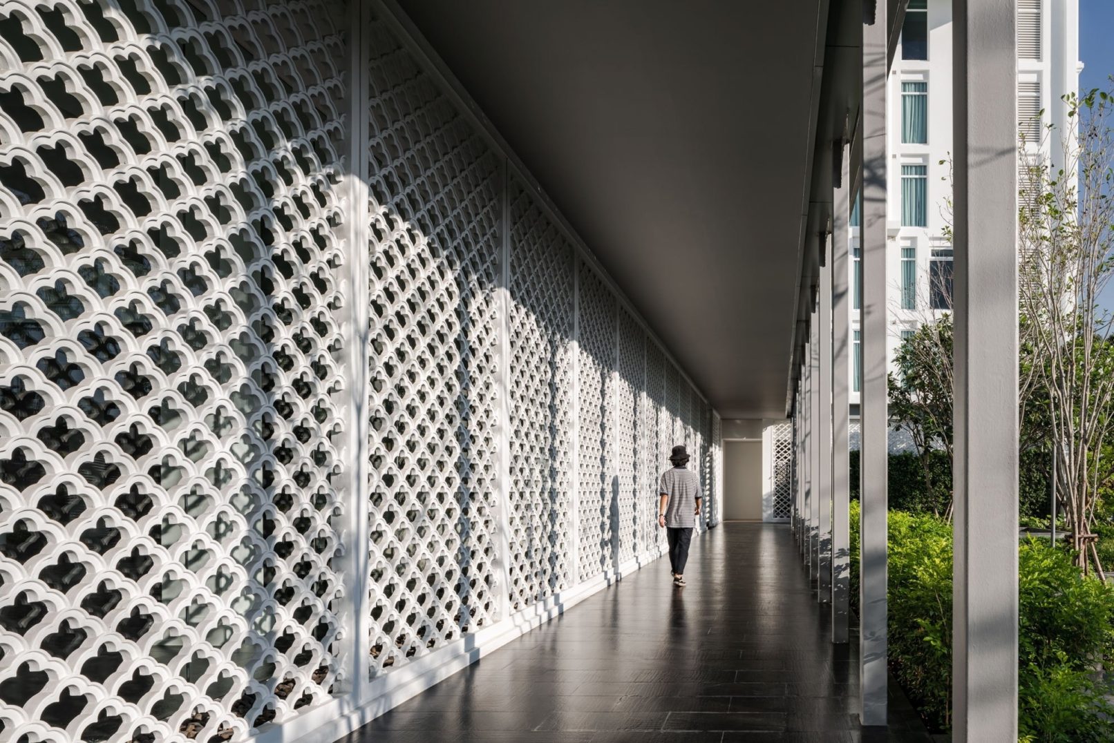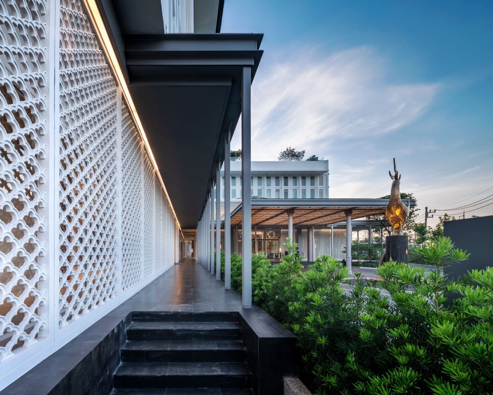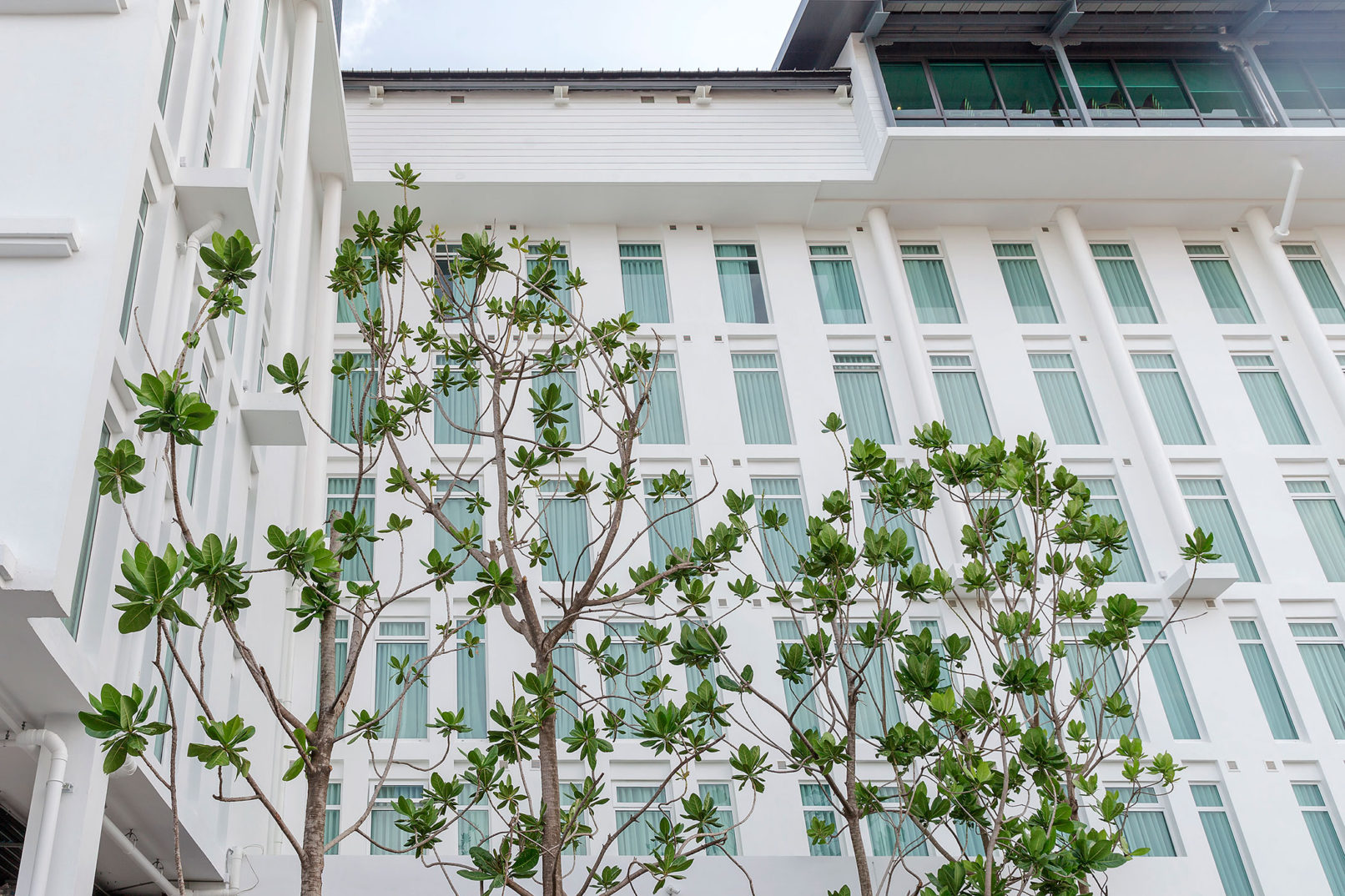 Looking in from the street, the hotel is surrounded with a luscious tree fence whose beautiful bright green bears a nice contrast with the white color of the building. At the hotel’s drop-off area stands a majestic sculpture in the shape of the phoenix bird, one of the Paranakan symbolic animals. The sculpture is complemented by a backdrop of trees meticulously chosen for the texture and size of the leaves that complement the presence of the architecture. From the tourist drop-off, a walkway designed to cut pass a small garden leads visitors into the building. The landscape around the building contributes a great deal to the lusciousness of the entire surrounding environment. Looking through the perforated wall at the Reception & Paranakan Court, one can see the green wall and green space around the hotel’s building that render the wonderful ambience with the varying light and shadow filtered through the foliage. The trees are positioned to help minimize the reflected sunlight from the building’s white walls during the day. The landscape at the ground floor is moderate in size but is designed to include a number of seats and be embraced by the delightful presence of trees with a slope added to the program to enable wheelchair access.